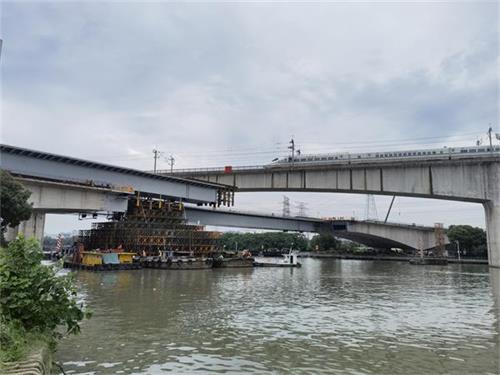 鋼箱梁分左右兩幅,材質(zhì)為Q345qD,左右幅橋鋼箱梁重量為1898.6t。采用兩側(cè)帶挑臂的等高度單箱單室結(jié)構(gòu),平面位于圓曲線上,外側(cè)箱梁中心線圓曲線半徑R877.25米,內(nèi)側(cè)箱梁中心線圓曲線半徑R862.75米;鋼箱梁主要由頂板、底板、腹板、橫隔板、橫肋及各自的加勁肋組成,外型幾何尺寸與砼箱梁保持一致,橋面設(shè)3%單向橫坡,橫坡指向曲線 內(nèi) 側(cè),箱梁中心線處梁高4.1米單幅鋼箱合段GL1和GL1梁段長5300mm重70t。左幅面跨中合批段長83133mm,右幅長81667mm。箱體及節(jié)段間連接全部采用焊接。