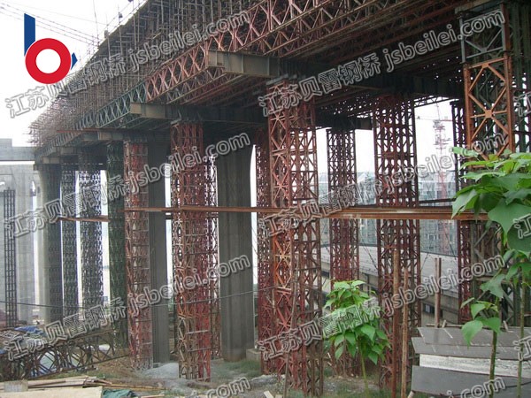 4.貝雷鋼橋斜面弦桿:用于使有加強弦桿的橋梁在推進過程中從滾輪上順利通過。分陰頭和陽頭兩種﹔安裝在析架下弦桿的起、止兩端,用銷子和斜面弦桿尾部的彎鉤與加強弦桿、析架連接。