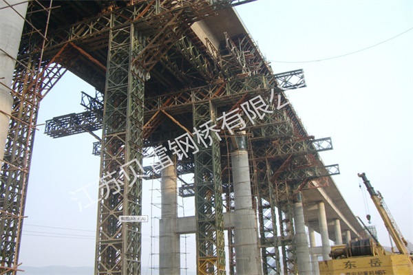 鋼橋桁架單元由上、下弦桿,豎桿和斜撐焊接而成。上、下弦桿的一端為陰頭,另一端為陽頭,在陰、陽頭上都有銷子孔。兩節(jié)桁架拼接時,將一節(jié)的陽頭插入另一節(jié)的陰頭內(nèi),對準(zhǔn)銷子孔,插上銷子。桁架各孔的用途如下:弦桿螺栓孔用于拼裝雙層或加強(qiáng)鋼橋時,將桁架螺栓或弦桿螺栓插入弦桿螺栓孔內(nèi),使雙層桁架或桁架與加強(qiáng)弦桿連接起來;支撐架孔用來安裝支撐架,當(dāng)桁架用作主梁時,用中間兩個孔,用作橋腳時,用端部兩個孔,以加強(qiáng)兩排桁架間的聯(lián)系;風(fēng)構(gòu)孔用于連接抗風(fēng)拉桿;端豎桿上的支撐架孔,用于安裝支撐架、斜撐和聯(lián)板;橫梁夾具孔用于安裝橫梁夾具。下弦桿上設(shè)有4塊橫梁墊板,墊板上有栓釘,用于限定橫梁的位置。